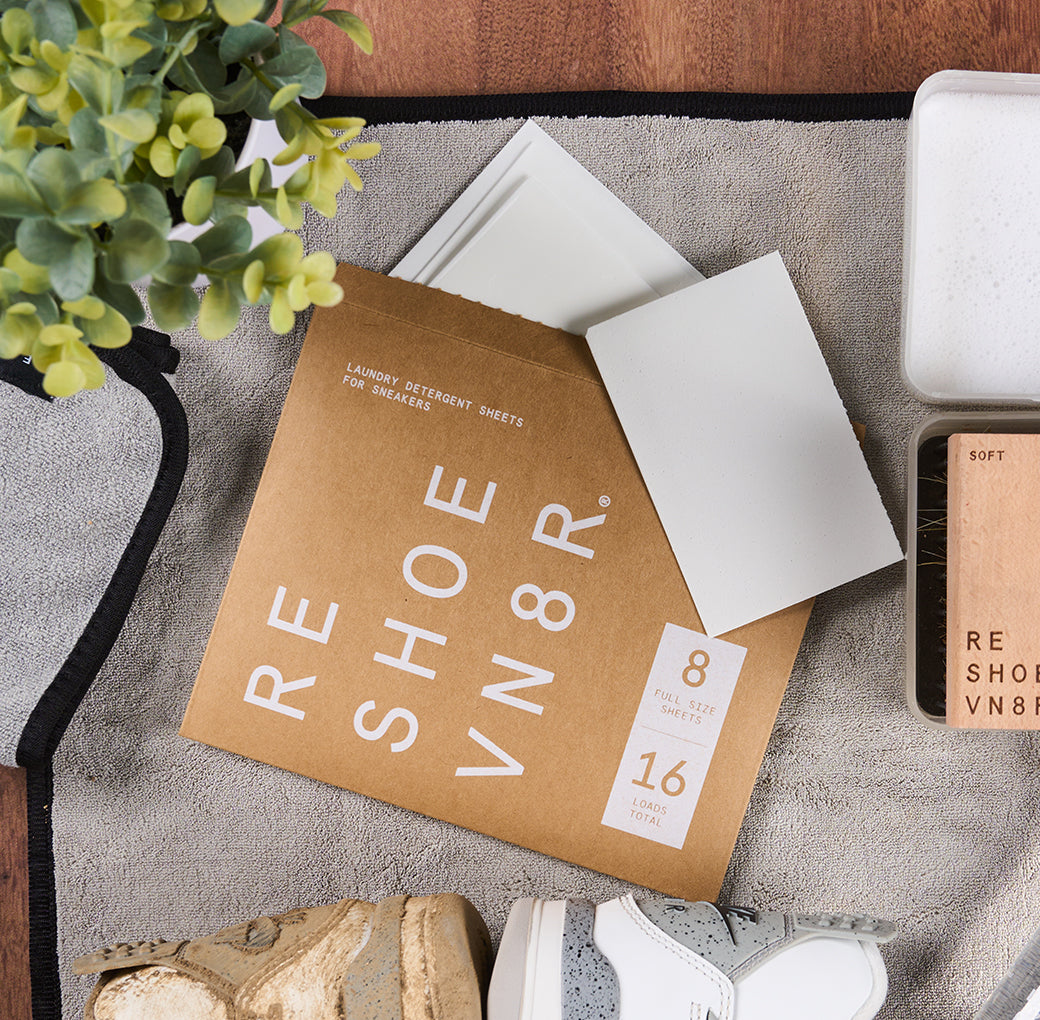 RESHOEVN8R Sneaker Laundry Sheets are a compact solution for deep cleaning your sneakers in the washing machine. Each sheet is perforated down the center, just tear in half, and drop in the wash. Each half sheet is strong enough to clean up to three pairs of shoes.