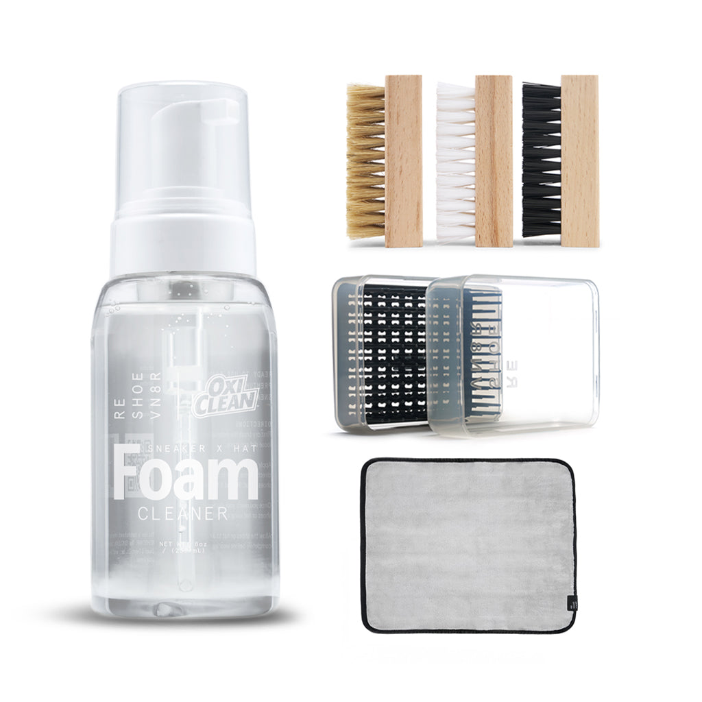 The RESHOEVN8R x OxiClean Foam Cleaning Bundle is your all-in-one solution for fast, effective sneaker and hat care. The ready to use pump action foam cleaner tackles dirt and grime on mesh, knit, suede, canvas, and more. While the variety of three included brushes give you the right tool for every material. Use the bowl to rinse your brushes between scrubs. After cleaning, place the brushes in the built in rack to air dry. When you're done, snap together for easy storage. The supplied Premium Microfiber Cleaning May is excellent for keeping your area dry, and allowing excess suds to drip off your shoes.